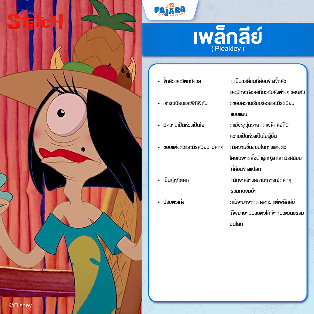 Pleakley (พลีคลีย์) – เอเลี่ยนสายหวานประหลาด: คู่หูของ Jumba เอเลี่ยนตาเดียวขายาวผู้มีความประหลาดในตัวสูงปรี๊ด โดยเฉพาะอย่างยิ่งความคลั่งไคล้โลกมนุษย์และแฟชั่น! เขามักจะสร้างเสียงหัวเราะด้วยความไร้เดียงสาและความพยายามในการปรับตัวให้เข้ากับวิถีชีวิตแบบโลกมนุษย์ที่ดูน่ารักไม่เบา