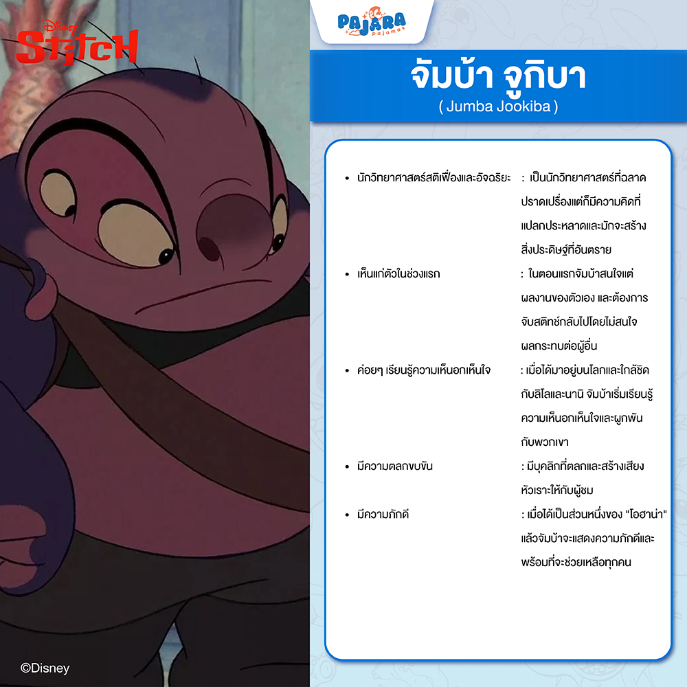 Jumba (จัมบ้า) – นักวิทยาศาสตร์จอมป่วน: อัจฉริยะผู้สร้าง Stitch ขึ้นมา แม้รูปลักษณ์ภายนอกจะดูน่าเกรงขามและบางครั้งก็โหดเหี้ยมไปบ้าง แต่ลึกๆ แล้ว Jumba ก็มีความอบอุ่นและมีมุมขำๆ ที่ทำให้เราอมยิ้มได้เสมอ เขาเป็นเหมือนพ่อที่คอยดูแล Stitch และ Lilo ในแบบฉบับของเขาเอง